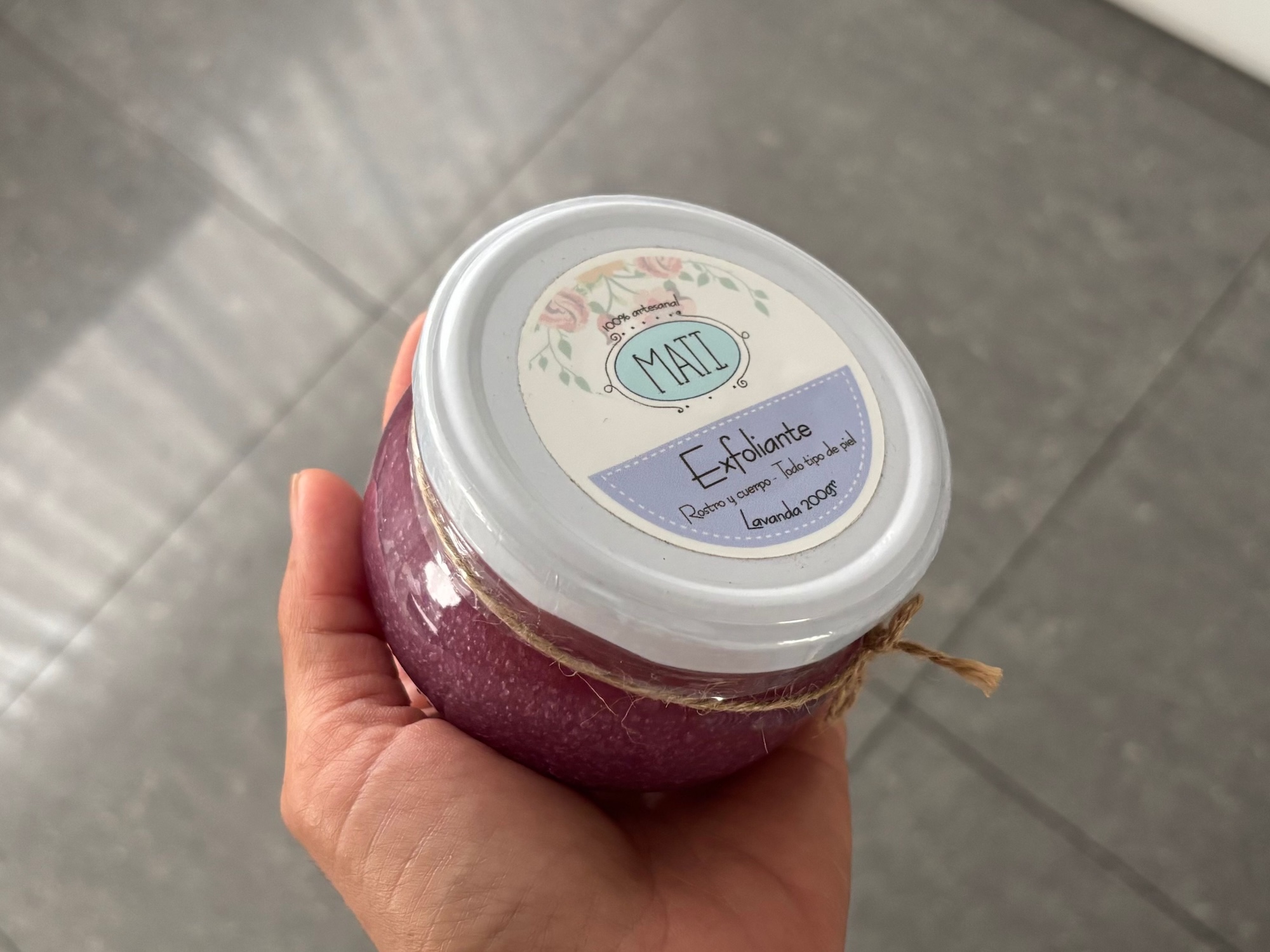 Está elaborado con azúcar, aceite de coco, aceite de oliva, miel de abeja, manteca de cacao, vitamina E y aceite esencial de lavanda.